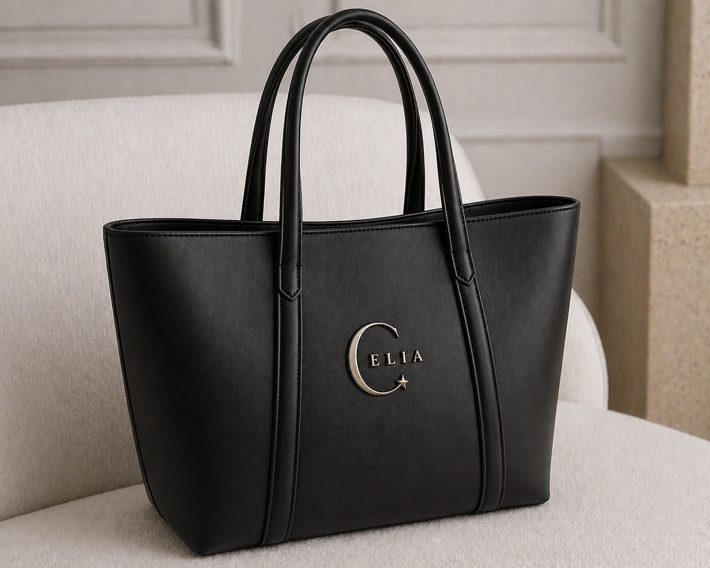 Le similicuir premium tient la route au quotidien. Le logo métallique doré fait toute la différence — ces détails qu'on remarque sans savoir pourquoi.